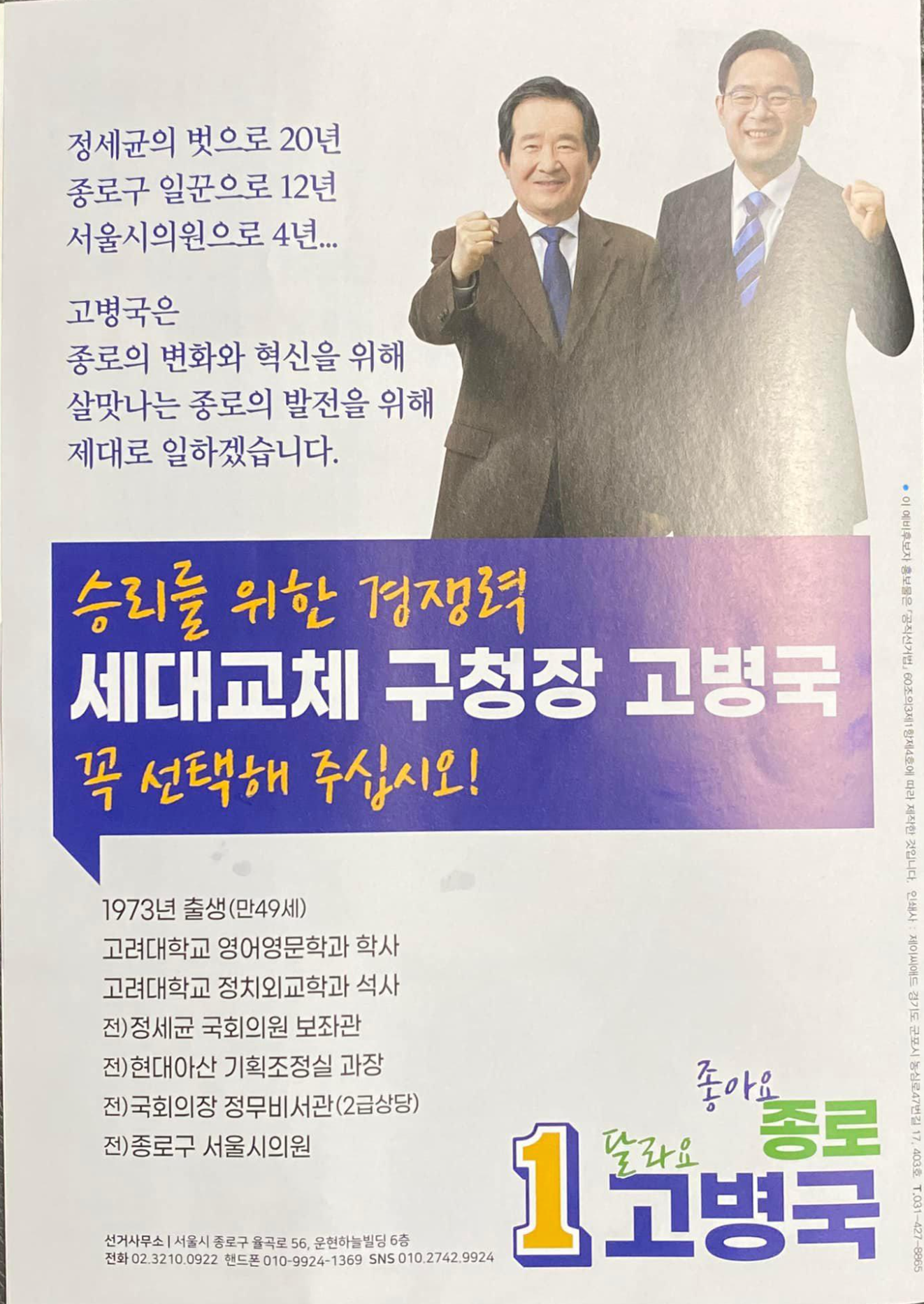 예비후보 홍보물의 주인공은 고병국 현 서울시의원이다. 정세균 전 의원의 비서 출신이라는 것은 익히 알고 있었으나 다시 한 번 이력을 잠시 살펴봤다.